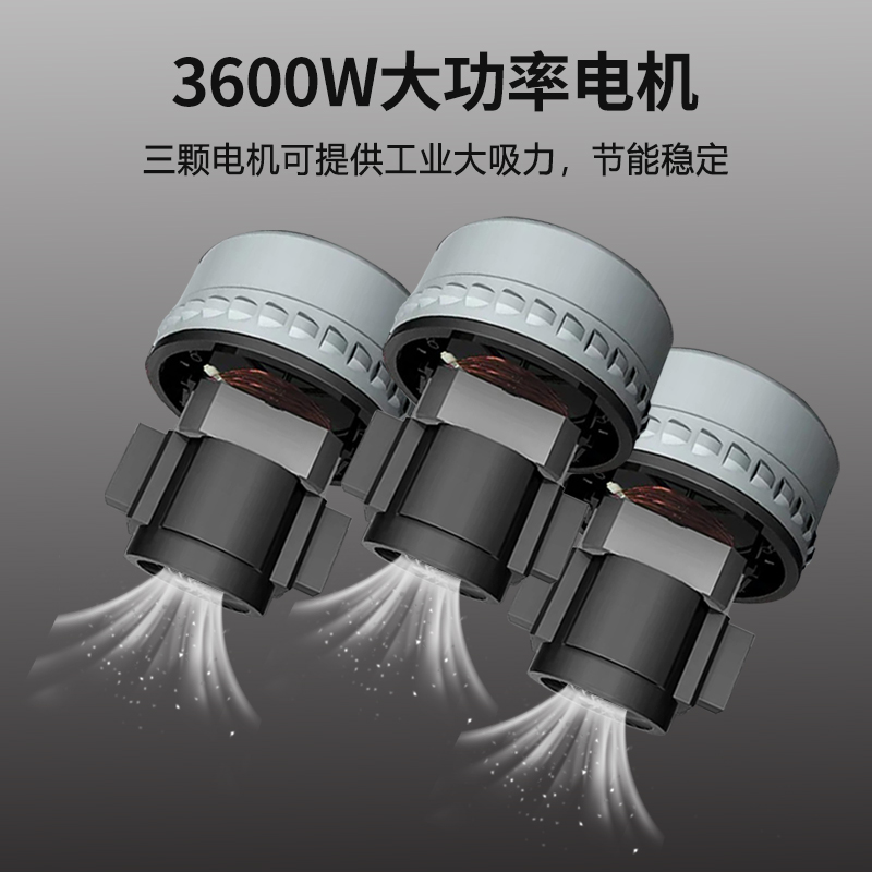 1、吸塵電機: WX-3610系列裝置3顆電機,功率可達3600W,吸塵、吸水干濕兩用;